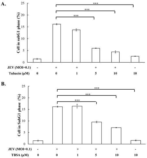 Inhibition of JEV-induced apoptosis by tubacin and TBSA. Cells were infected with JEV (MOI of 0.1), and immediately treated with tubacin (A) and TBSA (B). After 36 h incubation, cells were harvested, stained by PI dye, and then analyzed using flow cytometry. The percentage of sub-G1 phase in infected cells was presented. *** p value < 0.001 compared with mock-treated infected cells.