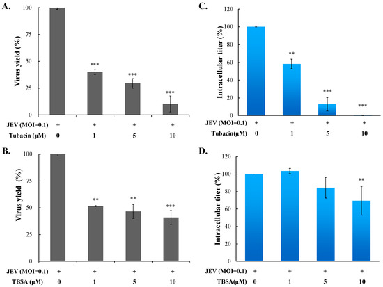 For determining anti-JEV activity of TBSA and tubacin on virus yield, JEV yield in a cultured supernatant of infected cells at an MOI of 0.1 in the presence or absence of TBSA and tubacin was measured using a plaque assay. Serial dilution of the supernatant was added onto BHK-21 cell monolayer in 6-well plates, incubated at 37 °C in 5% CO2 for 1 h, and then overlaid with 2 mL MEM medium containing 1.1% methylcellulose. After a 3-day incubation, the cell monolayer was stained with naphthol blue-black dye; in which viral yields were calculated by the number of viral plaques per mL. For measuring the inhibitory effect of TBSA and tubacin on intracellular viral titer, infected cells were harvested after a 36 h treatment with TBSA and tubacin (0, 1, 5, and 10 μM), and then lysed through three freeze-thaw cycles. The intracellular titer of infectious viruses in lysate was measured by the plaque assay mentioned above.