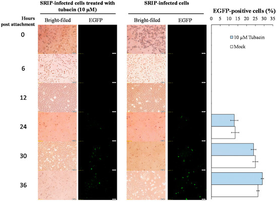 Real-time fluorescence imaging of the JEV SRIP-driven EGFP reporter for analyzing attachment inhibition by tubacin. Cells were infected with JEV SRIPs (10 TCID50), and then immediately treated with or without 10 µM tubacin for 1 h at 4 °C. After washing twice with PBS, bright-field and fluorescence images of infected cells were taken 0, 6, 12, 24, 30, and 36 h post infection (left panel). The percentage of EGFP-positive cells indicating SRIP replication in vitro was also calculated (right panel). Scale bar = 50 µm.