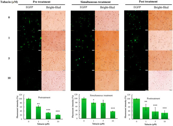 Antiviral mechanism(s) of tubacin against JEV was further evaluated using time-of-addition assays with JEV SRIPs and virions, including (1) pre-treatment (one hour prior to infection), (2) simultaneous treatment (at the same time as infection), and (3) post treatment (one hour post infection) (Figure 5 and Figure S3). The greatest degree of antiviral activity was observed in the mode of pre-treatment with tubacin compared to simultaneous- and post-treatment modes. According to the green fluorescence intensity of SRIP-driven EGFP reporter, IC50 value of tubacin was 1.89 μM in a pre-treatment assay, 4.88 μM in a simultaneous-treatment test, and 2.05 μM in a post-treatment experiment, respectively (Figure 5). Interestingly, post-treatment with tubacin was also very effective in inhibiting the late stage of JEV replication. Therefore, the results indicated that tubacin exhibited preventive and therapeutic activities against JEV infection, implying tubacin as a host-targeting agent to affect the involvement of cellular factors in JEV replication.
