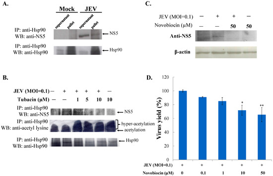 Protein-protein interaction, acetylation level, and function analysis of Hsp90 in JEV replication. For examining the interaction of Hsp90 with JEV NS5, co-immunoprecipitation assay was performed on the infected lysates. After centrifugation, lysate supernatants and precipitated pallets were further analyzed by Western blotting with anti-NS5 and anti-Hsp90 antibodies (A); For verifying the acetylation level of Hsp90, JEV infected cells treated with or without tubacin were harvested 36 h post infection; the lysate was accomplished using immunoprecipitation assay with anti-Hsp90 antibodies and protein A-Sepharose beads. The precipitates were examined by Western blotting with anti-NS5, anti-acetyled lysine, and anti-Hsp90 antibodies (B); For evaluating JEV NS5 expression in response to novobiocin, Western blotting analysis of infected cells was probed with anti-NS5 antibodies 36 h post infection (C); For studying antiviral activity of novobiocin, virus yield in the supernatant of treated infected cells was measured using plaque assays (D). * p value < 0.05; ** p value < 0.01 compared with untreated infected cells.