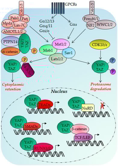 The NF2-Frmd6/1-WWC1/2 and Lin-7C/MMP5/Patj/Mpdz tumor suppressor complexes are involved in the mammalian apical-basal cell polarity (ABCP) and induce YAP/TAZ phosphorylation and inhibition [216,219]. AMOTL1/2, PTPN14, and α-catenin proteins maintain epithelial cell polarity and interact with YAP/TAZ sequestering them at the apical membrane and inhibiting their nuclear localization [227,228,229] (Figure 1). Several other proteins involved in ABCP integrity modulate the Hippo pathway [230]. In mechanical stretch conditions, YAP/TAZ activity is increased and is repressed when cells are compressed [10,231]. YAP/TAZ activation is also regulated by cell–cell contact abundance: high cell density induces YAP/TAZ phosphorylation and cytoplasmic retention [219]. It has been shown that GPCRs activate different heterotrimeric G proteins, which can activate or repress YAP/TAZ [232] (Figure 1). In response to stress-induced apoptosis, Mst1/2 are activated by auto-phosphorylation and caspase-dependent cleavage resulting in YAP phosphorylation and inactivation [233].