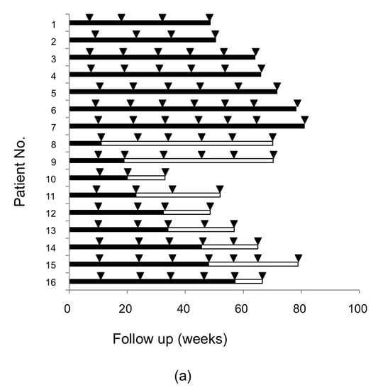 The DCV/ASV regimen was 100 mg of ASV twice daily plus 60 mg of DCV once daily for 24 weeks for 7 patients at Osaka City University Hospital and 18 patients at another hospital. DCV/ASV failure comprised 18 breakthrough patients and seven relapsed patients (Table 4). Liver cirrhosis was diagnosed based on a liver biopsy result or a transient elastography score of 12.5 kPa. To assess liver fibrosis, the FIB-4 index was calculated according to the formula: (age × AST (IU/L))/(platelet (×103/μL) × √AST (IU/L)) []. Among the relapsed patients, three had discontinued the treatment after 5 weeks due to adverse events. Ten patients failed to achieve an SVR with SMV/PEG-IFN/RBV followed by DCV/ASV therapy. After the treatments, the non-SVR patients were followed at Osaka City University Hospital every 12–16 weeks, and blood samples were taken during the visits.