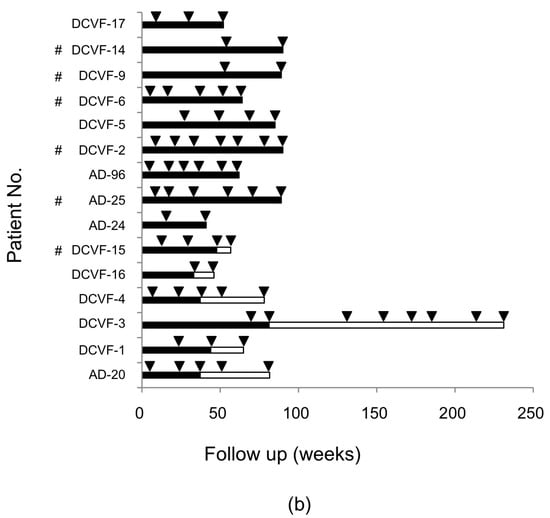 Alteration of D168 resistance-associated substitution (RAS) during follow-up after treatment failure. (a) Sixteen patients in simeprevir/pegylated-interferon/ribavirin (SMV/PEG-IFN/RBV) and (b) Fifteen patients in daclatasvir/asunaprevir (DCV/ASV) treatments were followed-up D168 RAS. Each line indicates an individual patient; the closed bar indicates a continuous predominant substitution and the open bar indicates a substitution reverting to the wild-type. Arrowheads indicate the point when RAS was determined. #: Patients with prior treatment of SMV/PEG-IFN/RBV.