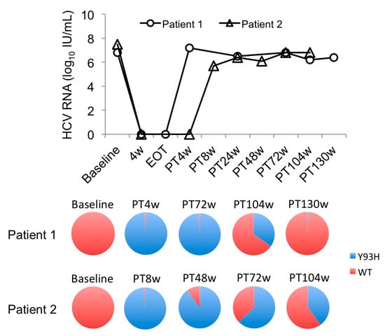 Next, the Y93H substitution was detected in the NS5A region in the 13 patients while the other two patients had a deletion mutation in NS5A. The Y93 RAS was continuously predominant in all patients during the 72 weeks of observation. However, the Y93 RAS reverted or was going to revert to the wild-type 100 weeks post-treatment (PT100w) in two patients. The proportion of Y93H was quantitatively analyzed using a polymerase chain reaction (PCR) invader assay. In patient 1, the proportion was >99% from the time of relapse (PT4w) until 72 weeks, then declined to 34% at 104 weeks, and finally became undetectable (<1%) at 130 weeks after the end of treatment (Figure 2). In patient 2, Y93H emerged (>99%) also at the time of relapse (PT8w), then gradually decreased the RAS signal to 90%, 63%, and 40% at 48, 72, and 104 weeks post-treatment. In addition, RASs at R30, L31 and A92 were detected in 5, 7 and 1 patient, respectively, at treatment failure. The RASs at R30 and A92 reverted to the wild-type in one patient during 24 weeks of observation, while the RAS at L31 did not.