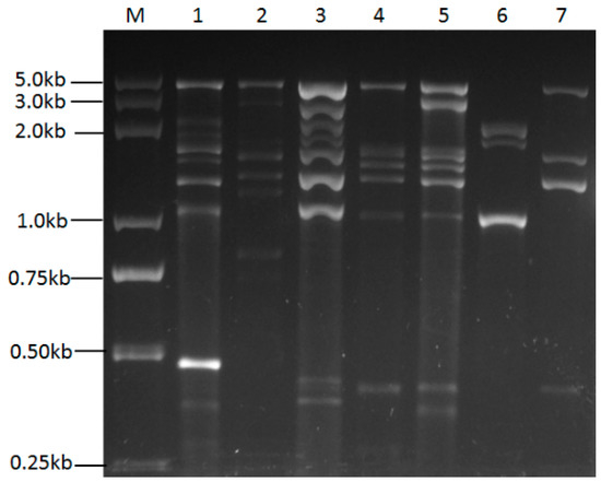 Figure 1. Agarose gel electrophoresis of dsRNAs extracted from several strains of U. virens. Lane M: 5 kbp ladder DNA marker; Lanes 1–7: FNH1212, Fyj1236, FNH1225, F10-15, F10-338, F10-341, F10-336.