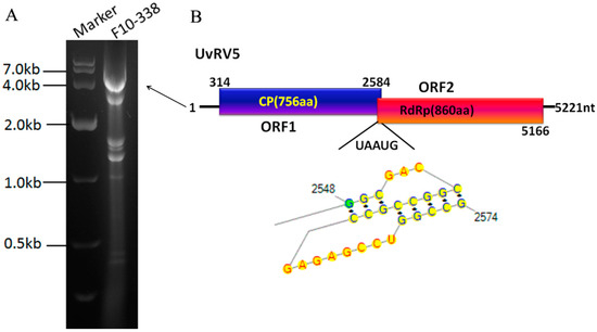 Figure 2. Electrophoresis and genome organization of UvRV5. (A) dsRNA banding pattern isolated from the U. virens strain F10-338 on a 1% agarose gel; (B) Genome organization of UvRV5. The genome of UvRV5 is 5221 nt in length and contains two overlapped open reading frames (ORF1 and ORF2), each of which encode a putative CP and RdRp, respectively. The sizes of the 5′-UTR and 3′-UTR are indicated above the solid line. The two ORFs are indicated by color boxes. A H-type pseudoknot structure consisting of stems and loops was predicted which were indicated by black and red characters, respectively.