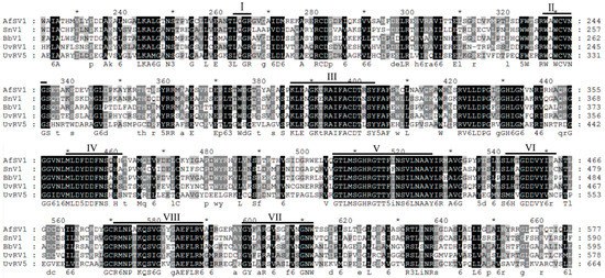 Figure 3. Multiple alignments of the amino acid (aa) sequences of the RdRp protein of UvRV5 and other related victoriviruses in the family Totiviridae. The conserved motifs of RdRp in dsRNA viruses are indicated by Roman numerals. The black and grey colors respectively mean that the amino acids were completely and partial conservative.