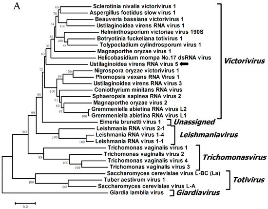 The neighbor joining (NJ) phylogenetic trees were constructed based on the RdRp and CP domains of UvRV5 and other representative members of the family Totiviridae. RdRp-based phylogenetic analysis, as shown in Figure 4, indicated that UvRV5 clustered with members of the genera Victorivirus and separated from the members of genera Leishmaniavirus, Trichomonasvirus, Totivirus, and Giardiavirus. In addition, the topologies between the CP- and RdRp-based phylogenetic trees were similar, further supporting the taxonomic status of the UvRV5 virus.