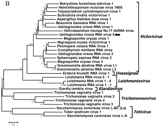 16. Zhang, T.; Jiang, Y.; Huang, J.; Dong, W. Complete genome sequence of a putative novel victorivirus from Ustilaginoidea virens. Arch. Virol. 2013, 158, 1403–1406. [Google Scholar] [CrossRef] [PubMed]