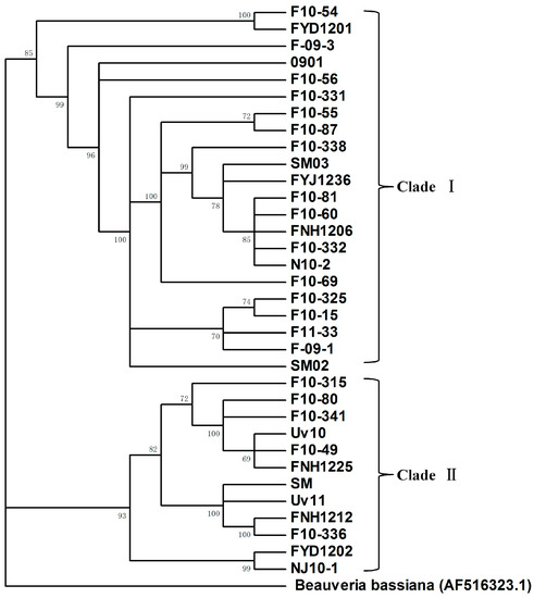 Figure 5. Maximum likelihood phylogenetic tree generated from the partial IGS rDNA region sequences of the U. virens strains. The Beauveria bassiana strain (AF516323.1) was included as an outgroup. The phylogenetic tree clustered the 34 U. virens strains into two main clades (Clade I and II).