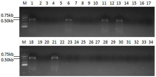 To check whether other U. virens strains were infected with UvRV5, RT-PCR was performed using primers designed based on this virus. The result showed that only five strains harboring the 5.3 kbp dsRNA banding pattern contained UvRV5 (Figure 6), indicating that not all the 5.3 kbp dsRNA elements that were infected in other strains belong to UvRV5, and they might be infected with other mycoviral species. Therefore, it can be assumed that the mycovirus diversity that exists in these analyzed U. virens strains is abundant.