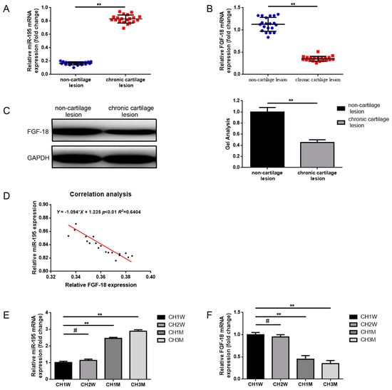 miR-195 expression was measured by real-time PCR while FGF-18 expression was detected by the use of real-time PCR and western blot test methods to evaluate joint fluid specimens of 20 patients with chronic cartilage lesions and in paired specimens of 20 patients with non-cartilage lesions. As shown in Figure 1A, miR-195 expression was noticeably elevated in the chronic cartilage lesion group compared to the non-cartilage lesion group (p < 0.01). By contrast, the expression of FGF-18 was noticeably decreased in the chronic cartilage lesion group when compared to the non-cartilage lesion group (Figure 1B,C) (p < 0.01). Meanwhile, the relationship between miR-195 and FGF-18 expression was analyzed by using a two-tailed Pearson’s correlation analysis, as revealed in Figure 1D, a negative correlation between the expression of miR-21 and FGF-18 was identified (p < 0.01).