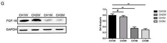 It is well known that compared to premature chondrocytes, the main problems observed during in vitro expansion of mature chondrocytes are poor proliferation ability and the phenomenon of dedifferentiation [,]. Since miR-195 and FGF-18 are involved in chondrocyte proliferation and dedifferentiation, as previously reported [,,], we wondered whether both of them are differentially expressed with respect to the different ages of chondrocytes. We isolated different ages of chondrocytes from 1-week-old, 2-week-old, 1-month-old, and 3-month-old rats (named as CH1W, CH2W, CH1M, and CH3M, respectively) and checked the expression of miR-195 and FGF-18 in the formerly mentioned chondrocytes. According to the results of real-time PCR, the expression of miR-195 was gradually elevated in chondrocytes with regard to aging (Figure 1E) (p < 0.01). Correspondingly, the FGF-18 expression was gradually decreased in chondrocytes with regard to aging (Figure 1F,G) (p < 0.01).