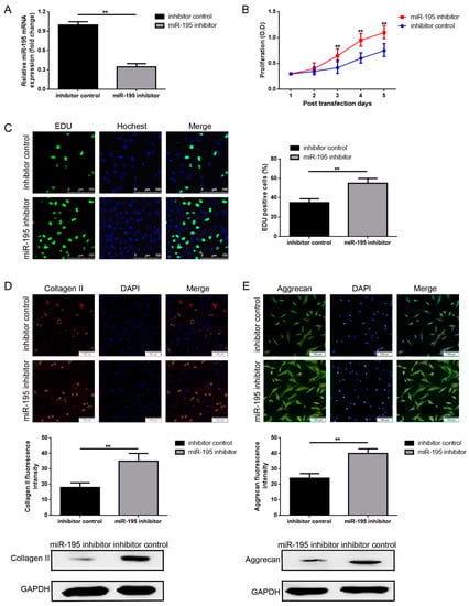 Since miR-195 was upregulated in chronic cartilage lesion patients and in chondrocytes with aging, we constructed the loss-of-function experiment to elucidate how the function of miR-195 might work in chondrocytes with special emphasis on proliferation and maintenance of chondrogenic phenotypes—expression of Col2a1 and aggrecan. First of all, passage 2 of CH3M chondrocytes were selected for all the following cellular detections. Secondly, as shown in Figure 2A, transfection of a miR-195 inhibitor into chondrocytes resulted in significant depression of miR-195 expression when compared to inhibitor control (p < 0.01). The outcomes of Cell Counting Kit-8 (CCK-8) and 5-Ethynyl-20-Deoxyuridine (EDU) indicated that the depression of miR-195 (transfection of miR-195 inhibitor) promoted chondrocyte proliferation (Figure 2B,C) (p < 0.01). Meanwhile, those observed with immunofluorescence staining, inhibition of miR-195 also promoted Col2a1 and aggrecan expression in chondrocytes (Figure 2D,E) (p < 0.01).