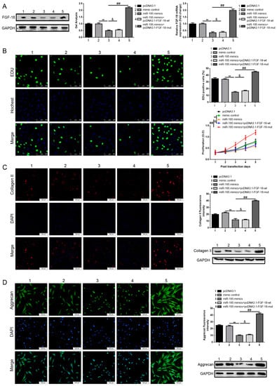 FGF-18 rescues the inhibitive effect of miR-195 on chondrocyte proliferation and Col2a1/aggrecan expression. (A) miR-195 mimics prominently depressed FGF-18 expression and the depressive effect was rescued by pmirGLO-FGF-18-mut, as detected by western blot and real-time PCR; (B) miR-195 mimics significantly inhibited chondrocyte proliferation and the inhibitive effect was reversed by pmirGLO-FGF-18-mut, as measured by CCK-8 assay and EDU; (C,D) MiR-195 mimics crippled Col2a1 (C) and aggrecan (D) expression and the crippled effect was rescued by pmirGLO-FGF-18-mut and evaluated by immunofluorescence staining. (Magnification, 200×; scale bar, 100 μm). ** p < 0.01 vs. miR-195 mimics group. ## p < 0.01 vs. miR-195 mimics group. & p > 0.05 vs. miR-195 mimics group. All experiments were repeated in triplicate while all data were normalized to pcDNA3.1 group and were shown as a mean ± S.D. (n = 3, each).