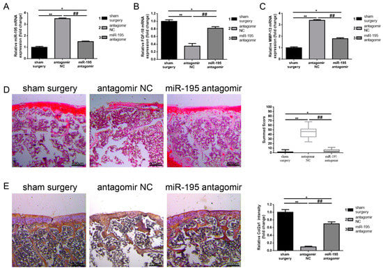 We used the anterior cruciate ligament transection (ACLT) method to simulate the chronic cartilage lesion models in rat specimens, as previously reported []. In brief, fifteen 8-week-old rats were divided into three groups randomly: sham surgery group (n = 5, non-ACLT and intra-articular injection of sterile saline), antagomir NC group (n = 5, ACLT and intra-articular injection of antagomir negative control), and miR-195 antagomir group (n = 5, ACLT and intra-articular injection of miR-195 antagomir). All rats were operated on using the right knee after sterilization with polyvinyl iodine (TargetMol, Boston, MA, USA). A medial parapatellar incision was made and the patella was dislocated laterally to expose the anterior cruciate ligament (ACL), then ACL was transected by using a #11 surgical blade in antagomir NC group and miR-195 antagomir group, but not in antagomir NC group, respectively. The medial retinaculum was repaired, and the capsule and skin was layer sutured. For the postoperative injection, 10 mg/kg antagomir negative control, 10 mg/kg miR-195 antagomir (Ribobio, Guangzhou, China), and the same volume of sterile saline was injected into the operated knee joint cavities fortnightly in the antagomir NC group, miR-195 antagomir group, and sham surgery group, respectively. After 8 weeks injection, the rats were sacrificed for further detection.