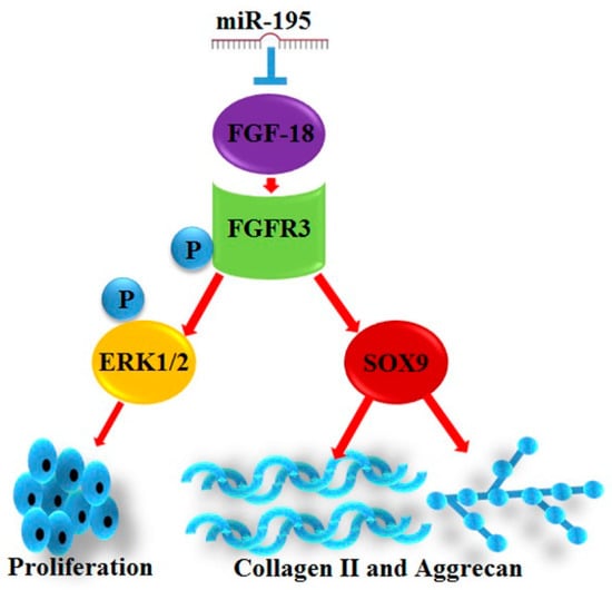 Fibroblast growth factor (FGF) phenomena are in evidence with regard to cell growth, differentiation, angiogenesis, inflammation, and other developmental processes such as skeletal development [,]. As a representative of the FGF family, fibroblastic growth factor 18 (FGF-18) plays a key role in skeletal development. []. Recent studies showed that FGF-18 was mainly distributed in perichondrium and joint space locations to work as a promoter in chondrocyte proliferation []. Bradley and colleagues reported that the inhibition of PH-domain and leucine-rich repeat protein phosphatase 1 (Phlpp1) promoted chondrocyte proliferation via the upregulation of FGF-18 expression []. Davidson et al. found that FGF-18 stimulated chondrocyte proliferation and matrix production via regulation of its downstream fibroblastic growth factor receptor 3 (FGFR3) []. It was reported that intra-articular injection of FGF-18 presented a protective effect on cartilage lesions [,]. To date, whether any miRNA could regulate FGF-18 to influence chondrocyte proliferation and chondrogenic phenotype maintenance remains unclear.