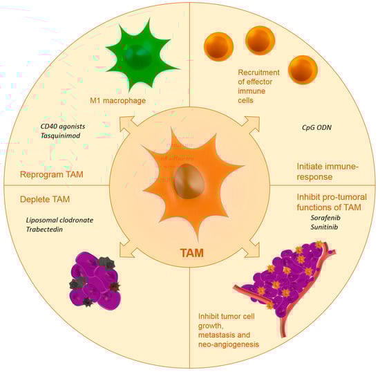 Proximity of TAM to the TME is necessary for TAM to maintain their tumor-promoting functions. Several strategies have been proposed in literature to reduce the tumor-promoting functions of TAM: