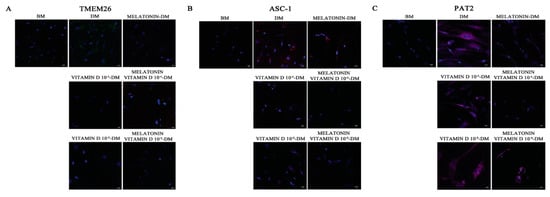 Figure 2 shows the immunofluorescence analysis of the adipogenic phenotype-marker proteins TMEM26, ASC-1, and PAT2. All these proteins are clearly evident in ADSCs committed to the adipogenic phenotype in the presence of the Differentiation Medium (DM, Figure 2A–C). On the other hand, TMEM26, ASC-1, and PAT2 were only faintly detectable in ADSCs committed towards adipogenesis in the presence of melatonin or vitamin D (10−6 or 10−8 M) (Figure 2, Melatonin-DM, Vitamin D 10−8 M-DM, Vitamin D 10−6 M-DM). Interestingly, when these compounds were contemporarily present in the Differentiation Medium, TMEM26, and ASC-1 were completely undetectable (Figure 2, Melatonin + Vitamin D 10−6 M-DM, Melatonin + Vitamin D 10−8 M-DM). PAT2 was inhibited by both melatonin and vitamin D at different concentrations, although still faintly detectable (Figure 2C).