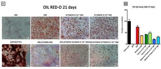 Effect of melatonin and vitamin D exposure on lipid accumulation in ADSCs during adipose differentiation. (A) shows the oil red lipid accumulation in mature adipocytes (positive control), adipose-derived stem cells cultured in basic medium (BM), and adipose-derived stem cells exposed for 21 days in the presence of the Differentiation Medium or the Differentiation Medium together with melatonin (Melatonin-DM) or with 10−6 vitamin D (Vitamin D 10−6 M-DM) or with 10−8 M vitamin D (Vitamin D 10−8 M-DM), or with both melatonin and vitamin D (Melatonin + Vitamin D 10−6 M-DM, Melatonin + Vitamin D 10−8 M-DM), scale bar 100 μm. The amount of lipid accumulation and (B) was calculated using ImageJ, with mature adipocytes as a positive control (black bar) and adipose-derived stem cells cultured in basic medium (white bar) as negative control for lipid accumulation. Adipose-derived stem cells were exposed for 21 days in the presence of Differentiation Medium (red bar) or Differentiation Medium together with melatonin (orange bar) or with 10−6 M vitamin D (Vitamin D 10−6 M-DM, dark green bar) or with 10−8 M vitamin D (Vitamin D 10−8 M-DM, light green bar) or with both (Melatonin + Vitamin D 10−6 M-DM, dark blue bar, Melatonin + Vitamin D 10−8 M-DM, light blue bar). Data are expressed as mean ± SD.