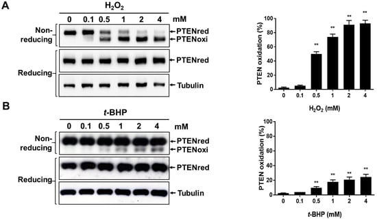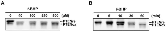 To investigate the effects of t-BHP on the redox state of PTEN, pre-reduced recombinant PTEN was incubated with various concentrations of t-BHP (0–0.5 mM) for 30 min, or increasing periods of time (0–60 min) with 0.5 mM t-BHP. After incubation, the reaction was quenched by N-ethylmaleimide (NEM) for 10 min to block free sulfhydryls in order to prevent further reaction. The exposure of recombinant PTEN to t-BHP resulted in the increase of faster migrating bands in non-reducing sodium dodecyl sulfate polyacrylamide gel electrophoresis (SDS-PAGE) than in the absence of t-BHP (Figure 1A,B). As we have previously demonstrated, the faster migrating bands corresponded to the oxidized PTEN [27]. Purified human PTEN was oxidized by t-BHP in concentration- and time-dependent manners.