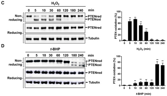 Effects of t-BHP and H2O2 on redox state of PTEN in HeLa cells. Hela cells were incubated either with the indicated concentrations of H2O2 (A) or t-BHP (B) for 30 min or incubated for the indicated times either with 1 mM H2O2 (C) or 1 mM t-BHP (D). After treatment with 1 mg/mL of catalase for 5 min, cellular protein extracts were then alkylated with 20 mM NEM and subjected to non-reducing or reducing SDS-PAGE followed by Western blot analysis with antibodies to PTEN. Tubulin levels were used as a loading control. All blot data are representative of at least three separate experiments. The intensity of PTEN bands were quantitated with ImageJ software (ImageJ 1.50i, National institutes of Health, Bethesda, MD, USA), ** p < 0.05 as compared to control.