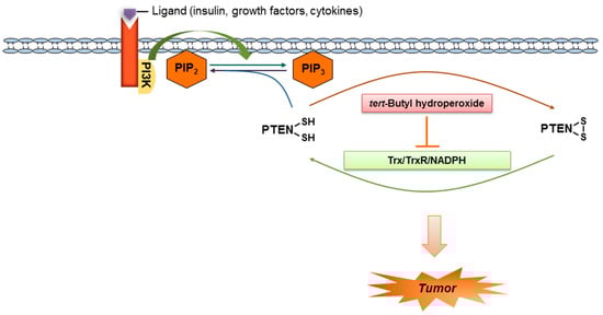 PI3K is activated by various cellular stimuli [44,45], resulting in the phosphorylation of phosphatidylinositol (4,5)-bisphosphate (PIP2) to phosphatidylinositol (3,4,5)-trisphosphate (PIP3). In the cytoplasm, PTEN dephosphorylates PIP3 to PIP2. The PI3K/Akt signaling pathway is negatively regulated by PTEN, which inhibits cell growth, proliferation, cell survival, protein synthesis, and transcription. PTEN thus plays a critical role for the inhibition of carcinogenesis. The present study shows for the first time that the PTEN tumor suppressor is one of the target molecules of t-BHP.