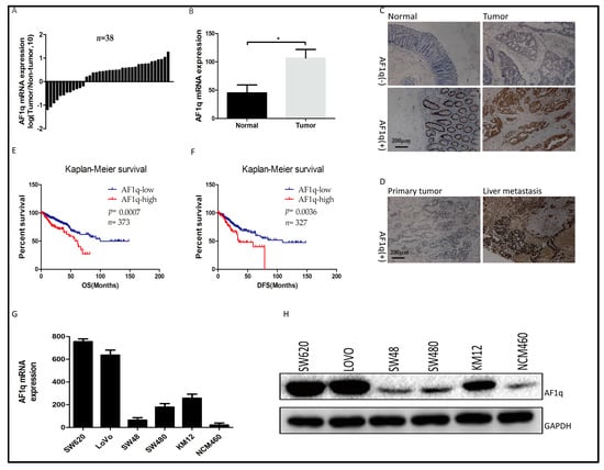 Expression analyses of AF1q in colorectal cancer (CRC) tissue specimens and cell lines. (A) qPCR analyses of AF1q mRNA expression level in 38 CRC tissues and paired normal tissues; (B) Histogram showing the average AF1q mRNA expression level in 38 CRC and paired normal tissues; (C,D) Representative immunostaining images showing AF1q expression in normal tissues, CRC tissues, and liver metastasis tissues (magnification: 100×). Scale bars: 200 μm; (E,F) Kaplan-Meier overall (OS) and disease free (DFS) survival analysis for CRC patients classified as having high or low levels of AF1q mRNA expression at the primary tumor site. For this classification, RNASeq data was downloaded from TCGA website [18,19]; (G) qPCR analyses of AF1q mRNA expression in five CRC cell lines (SW620, LoVo, SW48, SW480, and KM12) and one normal intestinal epithelial cell line (NCM460); (H) Western blot analyses of AF1q protein in the cell lines described in (G). Data are presented as the mean ± standard deviation, and are the average of three independent experiments. * p < 0.05.