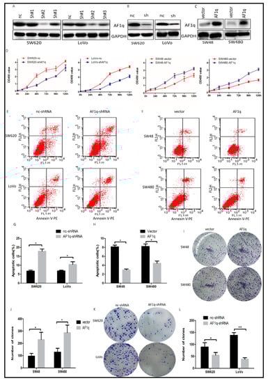 The effect of AF1q on CRC cell proliferation. (A) Western blot showing the effect of transiently transfected shRNAs sh#1, sh#2, and sh#3 on AF1q expression in SW620 and LoVo cells. Also shown is the negative control (nc) shRNA; (B) Western blot analysis of AF1q expression in SW620 and LoVo cells stably transfected with AF1q-shRNA (sh) or negative control (nc); (C) Western blot analysis of AF1q expression in SW48 and SW480 cells transfected with AF1q-expressing plasmid (AF1q) or empty vector control (vector); (D) The effect of AF1q knockdown (SW620 and LoVo) or overexpression (SW48 and SW480) on cell proliferation, as assessed by CCK8 assay; (E,G) The effect of AF1q knockdown in SW620 and LoVo cells on cell apoptosis, as determined using flow cytometry. Shown are representative flow cytometric data (E), and a summary of apoptosis in cells with or without AF1q knockdown (G); (F,H) The effect of AF1q overexpression in SW48 and SW480 cells on cell apoptosis; (I,J) The effect of AF1q overexpression on colony formation ability after 2 weeks, showing representative colony forming assays (I) and summary data (J) for each cell line, with and without AF1q overexpression; (K,L) The effect of AF1q knockdown on colony formation ability. Data are presented as the mean ± standard deviation of three independent samples. * p < 0.05, ** p < 0.01.