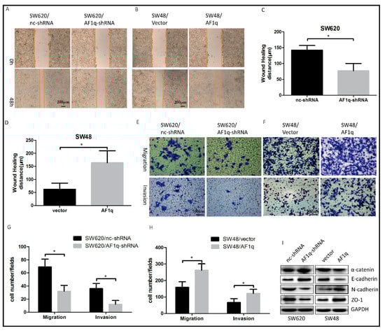AF1q promotes migration and invasion of CRC cells in vitro. (A,B) Representative wound healing assays showing that AF1q knockdown reduced the invasive potential of SW620 cells (A), while overexpression of AF1q promoted the invasive potential of SW48 cells (B) (magnification: 100×). Scale bars: 200 μm; (C,D) Histograms showing the average wound healing distance (μm) for the cells shown in (A,B), respectively; (E,F) Representative transwell assays showing that AF1q knockdown inhibited SW620 cell invasion and migration (E), while AF1q overexpression promoted SW48 cell invasion and migration (F) (magnification: 200×). Scale bars: 100 μm; (G,H) Histograms showing the average level of cell migration, from the data shown in (E,F), respectively; Statistical analysis was performed using three microscopic fields selected at random; (I) Western blot analysis of the indicated epithelial–mesenchymal (EMT) markers (α-catenin, E-cadherin, N-cadherin and ZO-1) following AF1q knockdown or overexpression in SW620 cells or SW48 cells, respectively. Data are represented as the mean ± standard deviation of three independent experiments. * p < 0.05.