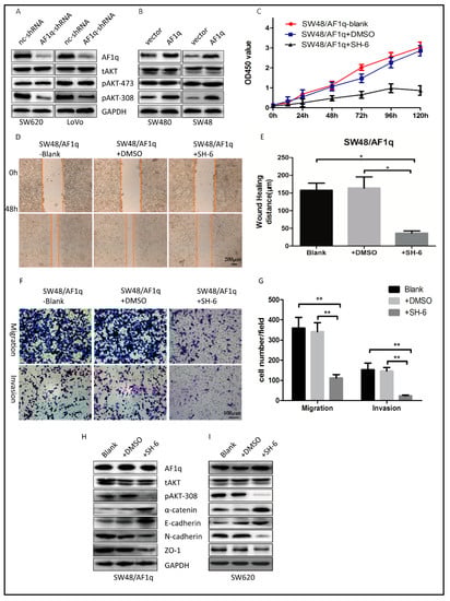 Next, we treated SW48/AF1q cells with the selective AKT inhibitor SH-6. We found that the cell proliferation, wound-healing, migration, and invasion capacity was reversed after inhibition of AKT with 10 μM SH-6 (Figure 4C–G). Furthermore, SH-6 reversed the EMT and inhibited pAKT-308 expression in SW48/AF1q cells (Figure 4H). In SW620 cells, which have high expression level of AF1q, SH-6 also reversed the EMT and inhibited pAKT-308 expression (Figure 4I). Together, AKT inhibition with SH-6 showed similar effects with AF1q knockdown. These results are compatible with the idea that AF1q regulates CRC cell proliferation, migration, invasion, and EMT induction by activating the AKT signaling pathway.