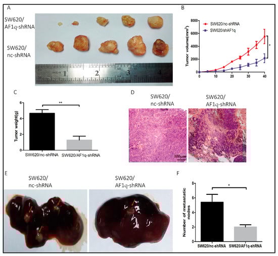 Having thoroughly examined the effects of AF1q in vitro, we further explored the effects of AF1q in vivo using a xenograft model, by injecting SW620/AF1q-shRNA cells or SW620/nc-shRNA cells subcutaneously into nude mice. The tumors originating from SW620/AF1q-shRNA cells were significantly smaller than tumors from the control SW620/nc-shRNA cells (Figure 5A,C,D). Furthermore, the tumors formed from SW620/AF1q-shRNA cells proliferated more slowly than those originating from SW620/nc-shRNA cells (Figure 5B). Next, to investigate CRC liver metastasis, SW620/nc-shRNA and SW620/AF1q-shRNA clonal cells were injected into the subcapsular splenic region in nude mice. Four weeks later, the mice were euthanized and their livers were investigated. Overall, 80% (4/5) of the SW620/nc-shRNA mice exhibited liver metastases, compared with 40% (2/5) of SW620/AF1q-shRNA mice (Figure 5E). Similarly, the number of liver metastatic nodules significantly decreased when AF1q was down-regulated (Figure 5F). Taken together, these data show that AF1q down-regulation inhibits CRC tumor growth and liver metastasis in vivo.