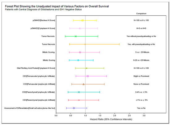 Compared to the histopathology results provided by local histopathology laboratories, the results of the central review deviated in only seven patients from the local diagnosis of glioblastoma (Table S2). Overall, the standard histopathology review was consistent with a typical glioblastoma patient population with a low number of IDH1 R132H+ tumor specimens [18]. The anatomical features associated with Ki67, such as mitoses and cellular density, were correlated (Table S3). MGMT status was not part of the assessment but should be included for studies in which temozolomide-based therapy is part of the clinical investigation [19]. The reason for not performing MGMT testing was based on the limited amount of tumor tissue and the focus on TGF-β-associated signaling and immune markers. Today, advanced technology allows for MGMT testing with smaller tumor tissue specimens; hence, this test may be integrated in future TGF-β-directed studies.