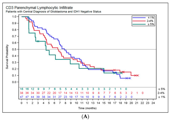 While not statistically significant, patients with increased parenchymal CD3+ lymphocytic infiltrate seemed to have shorter OS: ≤1% median OS 7.8 months; 2–4% median OS 6.7 months; ≥5% median OS 4.5 months (log rank p-value 0.7111) (Figure 2A,B).