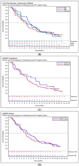 TGF-β-related signaling protein pSMAD2 was not increased in IDH1 mutation-positive patients (Table 2).