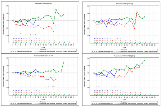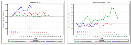 While on treatment, there were significant differences in CD4+, CD4+/CD8+ ratio, eosinophils, and total lymphocyte counts. All these immune cells were reduced in patients treated in both lomustine-containing arms compared to the galunisertib monotherapy arm (overall treatment p < 0.05). Compared to the lomustine-containing treatments, eosinophils, neutrophils, total lymphocyte, and monocyte counts remained largely unchanged during monotherapy with galunisertib. Differences in CD4+ T cell counts and CD4+/CD8+ ratio were more apparent from cycle 4 onward, but this observation is limited because most patients discontinued treatment at cycle 2 (Figure 3).