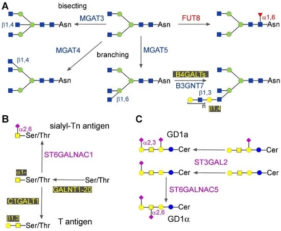 Structure of some core glycans. Monosaccharides are depicted according to this representation: blue square—GlcNAc, N-acetylglucosamine; yellow square—GalNAc, N-acetylgalactosamine; yellow circle—Gal, galactose; blue circle—Glc, glucose; green circle—Man, mannose; red triangle—Fuc, fucose; pink diamond—sialic acid, Sia. Anomers, linkage positions, and enzymes involved in relevant reactions are indicated. (A) N-glycans. As an example, the reactions are indicated using only the simple bi-antennary core structure as the substrate. Note that they are not alternative and can occur in various orders, because many of the indicated products can act as the substrate for several of the reported enzymes. An exception is represented by MGAT3 (bisecting enzyme) and MGAT5 (branching enzyme), whose reactions are mutually exclusive; (B) O-glycans; (C) Gangliosides. In both panels, the enzymes are indicated in the order in which they act.
