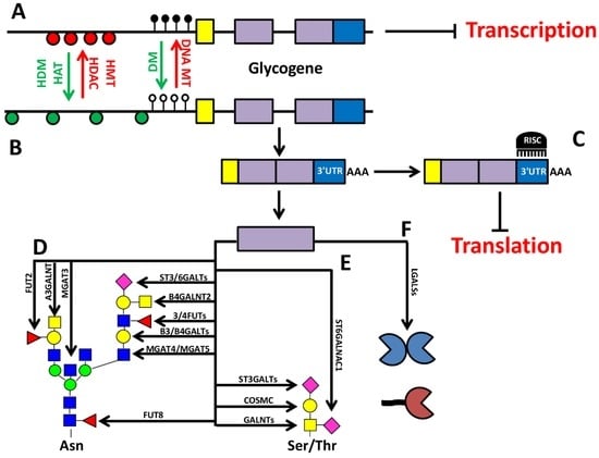 Summary of the common epigenetic mechanisms of glycosylation control. A hypothetical glycogene is represented in which the activity of histone methyltransferase (HMT), histone deacetylase (HDAC), and DNA methyltransferase (DNA MT) results in chromatin condensation determining a transcriptionally inactive state; closely spaced red circles represent nucleosomes, black lollipops represent methylated cytosine residues (A). The gene can be turned into a transcriptionally active state by the activity of histone demethylase (HDM) and histone acetyltransferase (HAT), which reduce chromatin condensation (loosely spaced green circles), and by demethylation of the promoter region (white lollipops) (B). Transcription of the gene results in a mRNA comprised of a 5′UTR (yellow), a protein coding region (violet), and a 3′UTR (blue), which can be targeted by miRNA, resulting in translation inhibition; RISC, RNA-induced silencing complex (C). This hypothetical glycogene is a paradigm of many others controlled by epigenetic mechanisms. They are involved in a variety of biosynthetic steps that are grouped in the hypothetic N- and O-linked structures depicted in (D) and (E). The epitopes shown in (D) and (E) are often mutually exclusive, and are presented here as a single structure only for didactic purposes. Moreover, glycogenes encode molecules like galectins (F) involved in the biological roles of glycans.