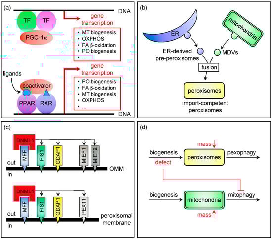 Peroxisomal and mitochondrial abundance are controlled by common sets of cis- and trans-acting factors. (a) Transcriptional control of peroxisome and mitochondrial biogenesis; (b) De novo peroxisome biogenesis requires mitochondria-derived vesicles; (c) Peroxisomes and mitochondria share components of their fission machinery. Shared and organelle-specific components of the fission machinery are indicated in color and gray, respectively; (d) Defects in peroxisome biogenesis impinge on mitophagy. Decreases and increases in organellar mass are indicated by red downright and upright arrows, respectively. Black horizontal arrows represent the formation of new organelles (left arrows) or the removal of damaged/dysfunctional organelles (right arrows). The red T-bar arrow denotes inhibition. ER, endoplasmic reticulum; FA, fatty acid; FIS1, mitochondrial fission protein; GDAP1, ganglioside-induced differentiation-associated protein; MDVs, mitochondria-derived vesicles; MFF, mitochondrial fission factor; MT, mitochondria/mitochondrial; OMM, outer mitochondrial membrane; OXPHOS, oxidative phosphorylation; PEX11, peroxin 11; PO, peroxisome/peroxisomal; TF, transcription factor.
