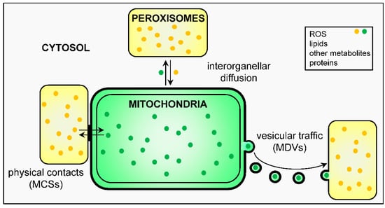 Eukaryotic cells are endowed with a diverse array of structurally and functionally discrete membrane-enclosed organelles. Such compartmentalization provides several distinct benefits, including (i) the creation of different local environments that facilitate specific metabolic functions; (ii) the sequestering of reaction intermediates and potentially toxic metabolites; and (iii) the ability to perform specific functions without interfering with other cellular processes []. However, cell organelles are not isolated entities and in order to exert their activities, they must actively communicate and interact with other subcellular compartments. This review provides a comprehensive overview of what is currently known about the functional and physical connections between peroxisomes and mitochondria, with a focus on mammals.