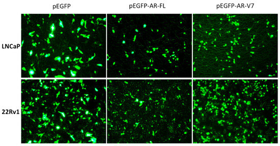 Fluorescence microscopy of LNCaP and 22Rv1 cells transfected with empty plasmid vector (pEGFP), plasmid encoding full-length androgen receptor (pEGFP-AR-FL), or plasmid encoding androgen receptor splice variant-7 (pEGFP-AR-V7). The signals were observed under a fluorescence microscope at 20× magnification. EGFP = enhanced green fluorescent protein.