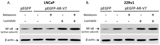 While it has been recently reported by us that melatonin can inhibit the constitutively active NF-κB via membrane G protein-coupled MT1 receptor in LNCaP and 22Rv1 prostate cancer cells [23], we would like to confirm that the MT1 receptor is responsible for mediating the inhibitory effect of melatonin on AR-V7 induced NF-κB activation observed in the present investigation. LNCaP and 22Rv1 cells were transfected with pEGFP or pEGFP-AR-V7 expression plasmid. The pEGFP-AR-V7-transfected cells were treated separately with 10−6 M melatonin, 10−6 M luzindole (a melatonin receptor antagonist), or 10−6 M melatonin plus 10−6 M luzindole. After 48 h of treatment with melatonin with or without luzindole, NF-κB activation in transfected cells was detected by immunoblot. As shown in Figure 7, expression of active NF-κB was increased after LNCaP and 22Rv1 cells were transfected with pEGFP-AR-V7. Of note, the activating effects of AR-V7 on NF-κB were blocked by 10−6 M melatonin. Furthermore, the inhibitory effects of melatonin on AR-V7-mediated NF-κB activation could be blocked by 10−6 M luzindole. In separate experiments, LNCaP and 22Rv1 cells were transfected with pEGFP expression plasmid and after 48 h of treatment with or without luzindole, NF-κB activation in transfected cells was detected by immunoblot. As shown in Figure S1, no effects of luzindole on active NF-κB levels in LNCaP and 22Rv1 cells overexpressing the pEGFP vector were observed. These results confirm that the observed inhibition of AR-V7 induced NF-κB activation by melatonin in the present investigation is mediated via membrane MT1 receptor, which has been shown by us previously to play an important role in transducing the antiproliferative action of melatonin on prostate cancer cells [23].