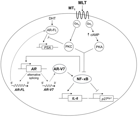 Schematic diagram showing the signaling pathways involved in melatonin receptor-mediated growth inhibition of prostate cancer cells. → denotes activation (may involve multi-steps); ⊣ denotes inhibition (may involve multi-steps). AR-FL and AR-V7 are full-length and truncated forms of AR, respectively, generated by alternative splicing of AR precursor mRNAs. Dotted line denotes transcription or translation. Abbreviations: MLT, melatonin; PKC, protein kinase C; PKA, protein kinase A; NF-κB, nuclear factor-kappa B; DHT, dihydrotestosterone; AR, androgen receptor; AR-FL, full-length androgen receptor; AR-V7, androgen receptor splice variant-7; IL-6, interleukin-6; PSA, prostate-specific antigen.
