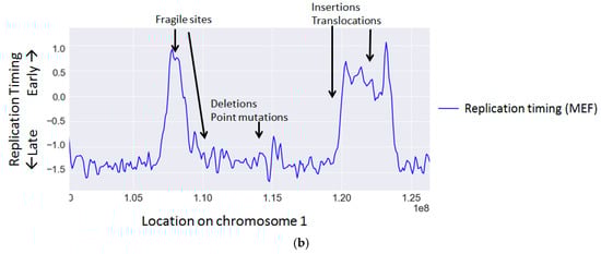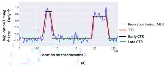 Representative replication timing profiles. (a) An example of a replication timing map of mouse embryonic fibroblasts (MEF) [111] for a 2 Mb-sized region labeled by region type: TTR (timing transition region) or CTR (constant timing region); (b) The same replication timing map with annotation of the regions prone to various types of mutations.