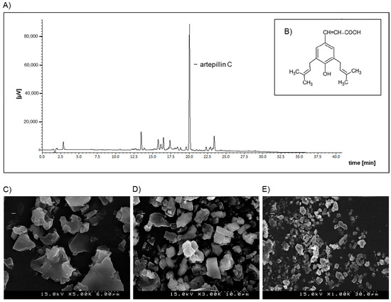 Representative HPLC chromatogram of (A) free artepillin C at 320 nm from the complex of green propolis supercritical extract encapsulated in γ-cyclodextrin (GPSE-γCD) and (B) its chemical structure; and (C–E) Morphological characterization of the GPSE-γCD complex by scanning electron microscopy. The GPSE-γCD complex was analysed at 15 kV in three different fields within each sample, and three images of each field were measured at the magnifications 1000, 3000 and 5000.