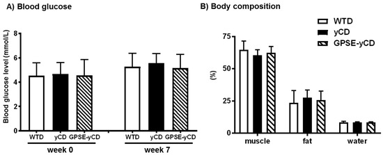 (A) Blood glucose and (B) body composition after 7 weeks in mice fed a Western-type diet (WTD), a WTD supplemented with γ-cyclodextrin (γCD) or a WTD supplemented with Brazilian green propolis supercritical extract encapsulated in γCD (GPSE-γCD). The fasting blood glucose levels in blood were measured using a glucometer at 0 and 7 weeks. Body composition was measured using a time-domain nuclear magnetic resonance technique in the live animals without using anaesthesia. The data are presented as the mean ± SD (n = 10 mice/diet). Statistical analyses were performed using one-way ANOVA, followed by Bonferroni correction or, in the case of inhomogeneity of variance, by Dunnett’s multiple comparison post hoc test.