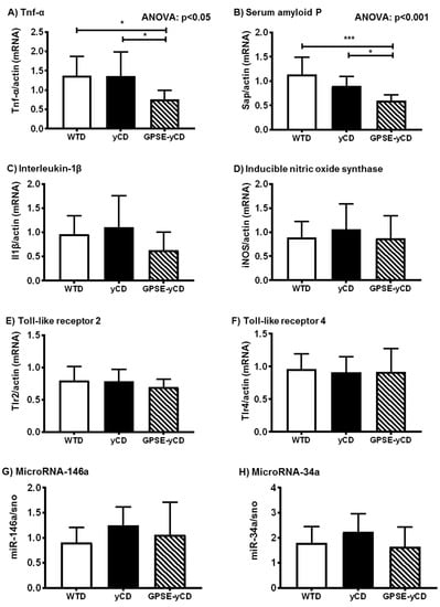 Expression levels of inflammatory genes as determined by quantitative reverse transcriptase PCR in the livers of mice fed a Western-type diet (WTD), a WTD supplemented with γ-cyclodextrin (γCD) or a WTD supplemented with Brazilian green propolis supercritical extract encapsulated in γCD (GPSE-γCD). The data are presented as the mean ± SD (n = 10 mice/diet). Significant differences were calculated using one-way ANOVA, followed by Bonferroni correction or, in the case of inhomogeneity of variance, by Dunnett’s multiple comparison post hoc test. * p < 0.05; *** p < 0.001. Expression levels of (A) TNF-α; (B) serum amyloid P; (C) interleukin-1β; (D) inducible nitric oxide synthase; (E) toll-like receptor 2; (F) toll-like receptor 4; (G) miR-146a; (H) miR-34a/sno are given.