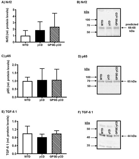 Relative expression levels of proteins as determined by Western blotting in the livers of mice fed a Western-type diet (WTD), a WTD supplemented with γ-cyclodextrin (γCD) or a WTD supplemented with Brazilian green propolis supercritical extract encapsulated in γCD (GPSE-γCD). (A,C,E) The relative intensities of bands were quantified by densitometry and the total protein in each lane was used as the loading control. The mean band intensity in the WTD group was set to be 1. Relative protein levels are presented as the mean ± SD (n = 10 mice/diet); and (B,D,F) Representative Western blots of nuclear factor erythroid 2-related factor-2 (Nrf2), p65 and transforming growth factor (TGF-β1) proteins detected by specific antibodies in the livers of mice, fed the different experimental diets.