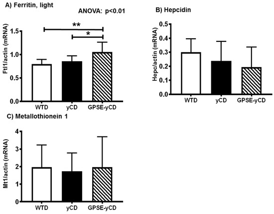 Interestingly, mRNA levels of ferritin were significantly higher in the GPSE-treated mice than in the controls (Figure 5A). Hepatic hepcidin and metallothionein gene expression levels were similar among the groups (Figure 5B,C).